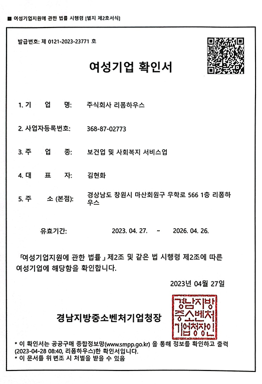 - 여성기업 지정(제0121-2023-23771호)
