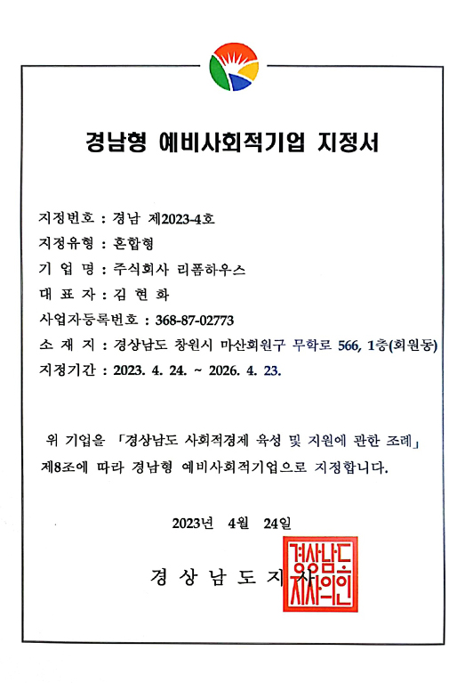 - 예비사회적기업 지정(경남 제2023-4호)